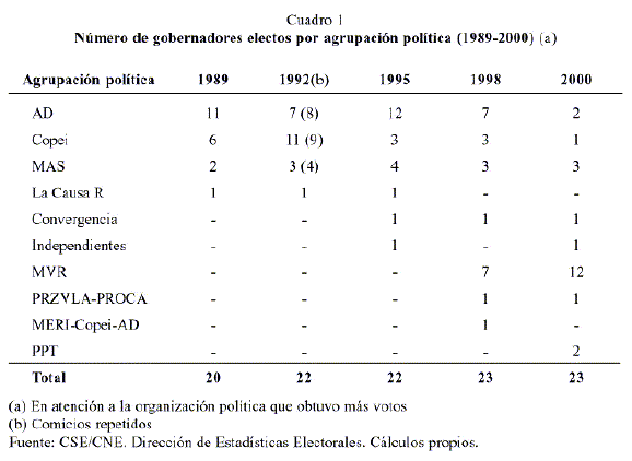Para 1998, fueron 7 la totalidad de los gobernadores electos apoyados principalmente por AD + alianzas, 6 fueron elegidos en una coalición que tenía como partido fuerte a Copei, 3 por el MVR, igual número por el MAS, y 1 perteneciente a Convergencia, a Proyecto Venezuela (PRVZLA)-Proyecto Carabobo (PROCA), y a MERI, representando los dos últimos a organizaciones políticas de carácter regional. En los últimos comicios el mapa político de las regiones cambió, la mayoría de los gobernadores electos salieron de las filas del acuerdo del MVR con otras organizaciones, desplazando a AD, tal como podemos observar en el cuadro 1.