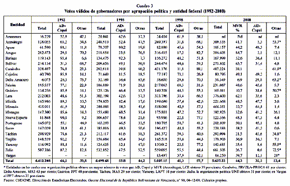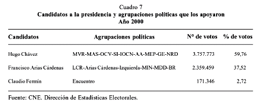Disgregación y fragmentación del poder. El voto siguió orientándose en las elecciones regionales y en las de los miembros para la Asamblea Nacional hacia el multipartidismo. Aunque el número de partidos y grupos políticos en todos los niveles de poder disminuyó, la forma de votar del electorado siguió siendo atomizada y fragmentada, fortaleciendo la disgregación partidista electoral, sin que ello incidiera en una ampliación de la dispersión ideológica existente. Sin embargo, los resultados de los comicios nacionales de 2000 presentaron ligeras diferencias. La competencia electoral fue la más baja habida en los diez procesos electorales celebrados en Venezuela desde 1958. Sólo hubo tres candidatos a la Presidencia de la República y 16 organizaciones políticas que los apoyaron, en tanto que en 1998 hubo un total de 11 candidatos y 31 organizaciones políticas. A esta conducta electoral habría que hacerle seguimiento y analizar su comportamiento, al menos para las próximas elecciones regionales y locales.