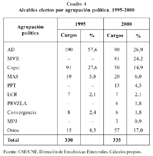 Otro es el mapa político que se dibuja a partir de los resultados de la elección para alcaldes. En este ámbito, la representación política de los dos grandes partidos tradicionales AD/Copei, aunque bajó respecto a las elecciones de 1995 (cuando juntos obtuvieron 87 por ciento de los cargos) siguió siendo alta. De los 335 alcaldes electos en todo el país, 90 pertenecen a las filas de AD y 50 a las de Copei, juntos aglutinan 51 por ciento de la representación local a este nivel, mientras que el MVR, MAS y PPT juntos llegan al 35 por ciento. Es significativo mencionar que el porcentaje obtenido por el MVR más alianzas es alto, considerando que fue la primera vez que esta agrupación incursiona electoralmente en este nivel (véase cuadro 4).