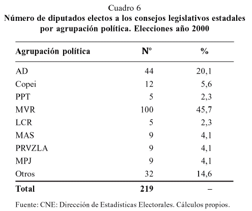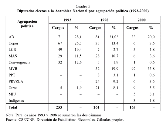 Los resultados de las elecciones parlamentarias son los que informan sobre las preferencias partidistas del elector y expresan la fuerza que tiene cada partido o agrupación política en el nivel nacional. Los datos de las elecciones de 2000 muestran una dispersión del voto entre 9 o más organizaciones políticas. En 1998, la dispersión del voto giró alrededor de 8 organizaciones. Los cambios habidos entre 1998 y 2000 indican que del total de los cargos a diputados para la Asamblea Nacional en 1998 (antiguo Congreso Nacional), 44 por ciento estuvo en manos de los partidos AD-Copei; en 2000 el panorama cambia y la concentración del voto adeco-copeyano bajó a la mitad, hasta llegar a 24 por ciento. Así mismo, los parlamentarios elegidos pertenecientes a las filas del MVR más alianzas, pasaron de concentrar 20 por ciento de los cargos en 98 a 56 por ciento en 2000 (véase cuadro 5).