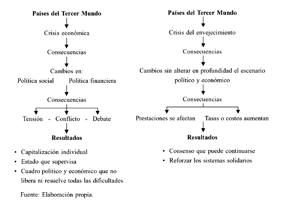 La economía y la demografía, si bien forman parte de un mismo equipaje causal en todos los países que han emprendido reformas, el peso que la primera tiene ha sido determinante, en tanto que de apoyo adicional ha servido la segunda y razonablemente mayor en Argentina, Chile y Uruguay, países con poblaciones más envejecidas. Sin embargo, Europa, dejando a salvo contadas excepciones, ha optado pese a la edad de sus pueblos por la solidaridad.