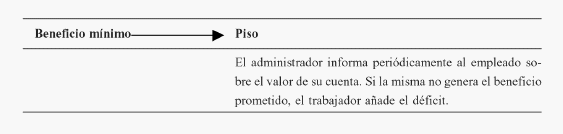 Las modalidades de operación de varios niveles de financiamiento son variadas. Una de ellas es la de mantener los fondos de pensiones individuales y solidarios separadamente y con administración también diferenciada. El trabajador que no cuente con recursos para el beneficio prometido por el fondo solidario debe añadir recursos ahorrados al déficit, lo que suele proponerse en los planes ocupacionales por empresa. Esta modalidad corresponde a un «plan híbrido de pensiones» que combina la cotización definida con el beneficio prometido y está muy difundida en EE UU, debiendo el empleado añadir la cantidad al déficit del fondo administrado por su empresa si el mismo no genera suficiente crecimiento para lograr la prestación (Fabozzi, Modigliani y Ferri, 1996). La empresa informa periódicamente al empleado sobre el valor de su cuenta y si la misma no genera el beneficio prometido el trabajador añade el déficit, como a continuación se grafica: