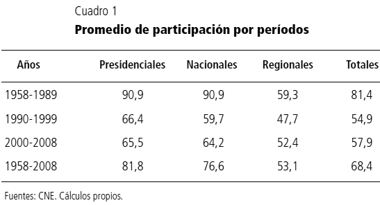 Por su parte, el promedio de participación para todo el período democrático en Venezuela (1958-2008) es significativamente mayor, evidencia de la erosión del sistema político durante la década de los noventa, como se observa en el cuadro 1.