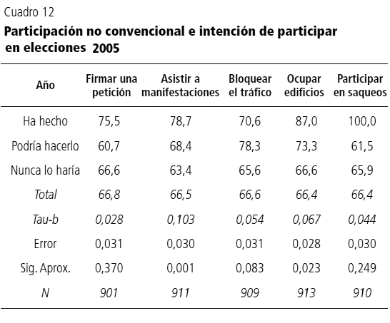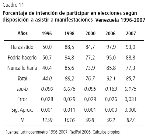 No obstante, Venezuela se caracteriza por una tendencia contraria: las formas de participación no convencional, lejos de presentarse como un mecanismo que compita con los medios tradicionales de participación política, se entrelazan con estos conformando y fortaleciendo una alianza democrática. En este sentido, a partir del cuadro 11 podemos inferir que quienes muestran mayor disposición a participar en manifestaciones también muestran mayor intención de concurrir a elecciones, aumentando su significación en los años de mayores tasas de participación. Igualmente, el cuadro 12 muestra que aunque otros tipos de actividades no convencionales distintas a la manifestación política no muestran niveles de correlación significativos, mantienen la relación en el continuo que va desde la firma de una petición hasta acciones no convencionales como la toma de edificios y participación en saqueos.