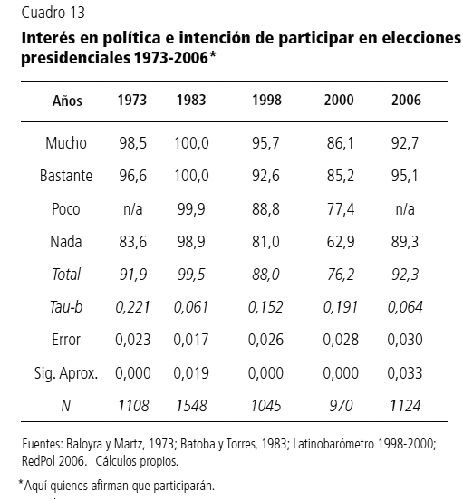 A esto debemos sumar que si bien la mayoría de las variables de cultura política se encuentran en ascenso continuo desde los años setenta (y que algunas de ellas han experimentado una aceleración importante con la entrada del siglo XXI), aún se mantienen en umbrales característicos de sociedades premodernas, imposibilitando que los niveles de participación electoral se mantengan por efecto único de dichas variables.