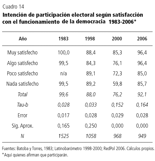 Otro elemento importante al revisar la participación electoral es el grado de satisfacción con la democracia. En su clásico libro Political Man, S.M. Lipset (1963) ha señalado que cuando la democracia funciona correctamente, genera una cierta apatía en la población que expresa «no su desafección democrática», sino su confianza en que independientemente de los resultados electorales, el sistema democrático funcionará correctamente y en beneficio de la población. No obstante, en esta investigación encontramos evidencias que contradicen esa hipótesis, al mostrar que la relación parece estar en ascenso en el transcurso del tiempo, es decir, la abstención se está consolidando como estrategia de protesta en contra del régimen democrático, tal como se observa en el cuadro 14.8