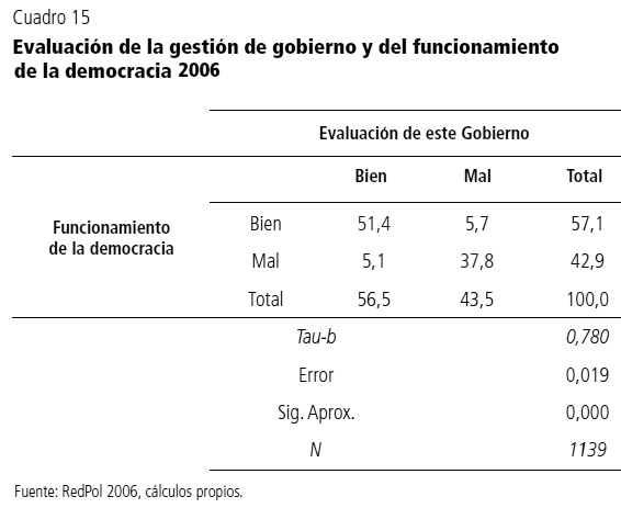 El cuadro 15 muestra la relación propuesta por David Easton y estudiada en Venezuela por Arturo Sosa (Easton, 1979; Sosa, 1991, 1997, 1999) entre el ideario democrático y su ejecución. En este sentido podemos afirmar que el 89 por ciento de los venezolanos muestra una relación «coherente» entre su evaluación del Gobierno y la evaluación de la democracia, con una correlación muy alta y significativa. Cabe destacar que un 37,8 por ciento de la población asocia de forma negativa ambos factores.