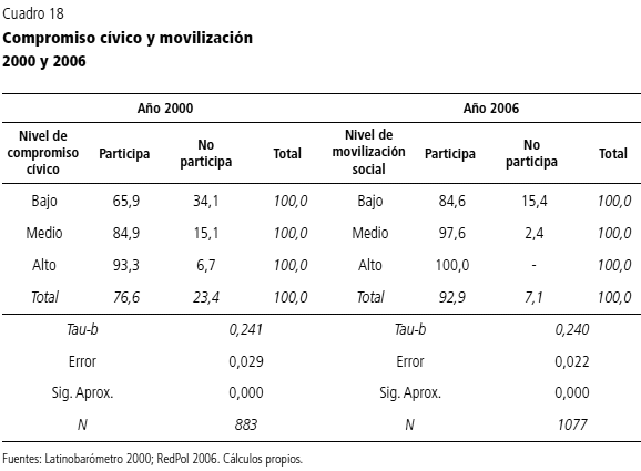 11 Para el año 2000, en la construcción del indicador de compromiso cívico se utilizaron las variables del estudio Latinobarómetro: interés en política, confianza en el Congreso, confianza en los partidos políticos, participación en una organización comunitaria, interés en política y satisfacción con la democracia; para el año 2006 se utilizaron las variables del estudio RedPol, para la construcción del indicador de movilización: participación en una organización comunitaria, asistencia a manifestaciones, satisfacción con la democracia y militancia partidista.
