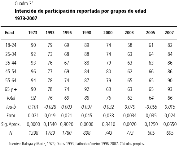 De esta manera, al revisar los datos sobre intención de participación electoral por grupos etarios podemos observar que el comportamiento es cambiante en el tiempo. Sólo el rango de edades entre los 55 y 64 años mantiene un promedio de participación en elecciones superior al promedio general excepto en el año 1998. Los dos grupos más jóvenes (de 18 a 24 y de 25 a 34 años), por su parte, son los que están en mayores ocasiones por debajo del promedio general (v. cuadro 3).