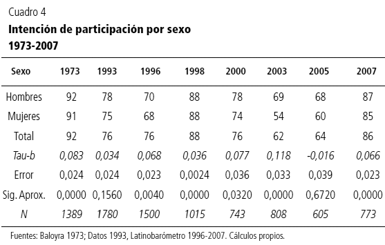 En cuanto al sexo, a pesar de que los hombres reportan niveles de participación mayores a los de las mujeres a lo largo de todas las mediciones disponibles, tal como se observa en el cuadro 4, los resultados del estudio de las correlaciones no sugieren la existencia de una relación significativa entre ambas variables.