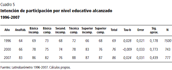 Si bien la diferencia en las tasas de participación entre los que se encuentran satisfechos y no satisfechos con el funcionamiento de la democracia es aún pequeña (aunque significativa, con niveles de bajos a moderados de asociación), pareciera que mayores niveles de insatisfacción podrían traducirse en niveles de abstención superiores a los experimentados durante las últimas dos décadas: la permanencia en el tiempo de la insatisfacción con el sistema democrático se traduce en la deslegitimación del ideario democrático y en menores tasas de participación electoral.