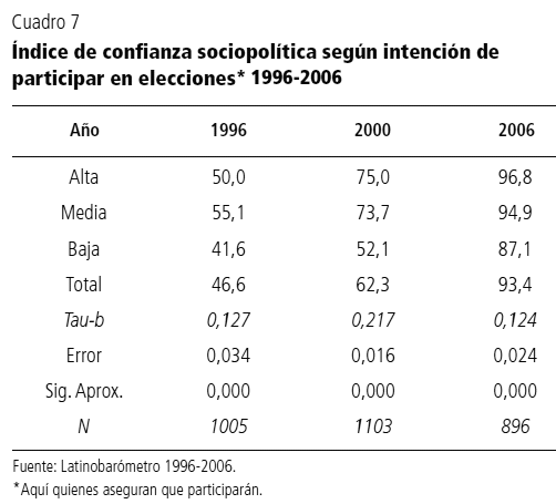 El cuadro 6 muestra que para los años de elecciones presidenciales se mantiene una diferencia constante en los niveles de confianza interpersonal, según la intención de participar en elecciones, siendo siempre mayor al promedio la del grupo que manifiesta intención de participar.