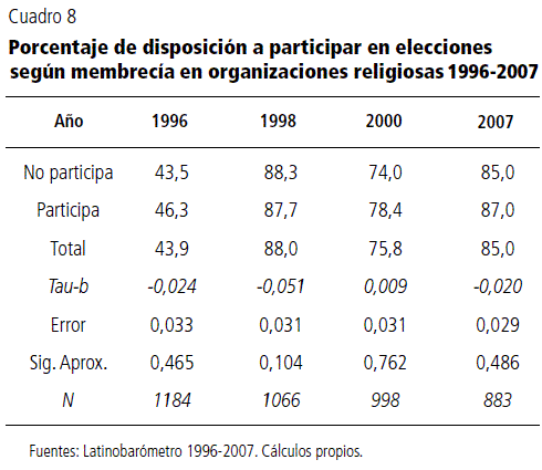 En la literatura, la participación en organizaciones tradicionales y especialmente en las religiosas y políticas se encuentra relacionada de forma significativa con la participación electoral. En este sentido, Norris (2002:187), basándose en su investigación sobre agencias tradicionales de movilización, afirma que «la membrecía en sindicatos y organizaciones religiosas está altamente relacionada con la participación electoral, así como con participación en otras organizaciones civiles y en movimientos de protesta». Sin embargo, al revisar esta relación en la sociedad venezolana encontramos que a pesar de que existe una mayor disposición a participar en elecciones entre los miembros de las organizaciones religiosas, la diferencia no es significativa, tal y como lo muestran los índices de correlación en el cuadro 8.