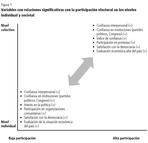 En los escenarios de baja participación electoral acuden al llamado aquellos individuos que poseen una mayor confianza en instituciones, que participan en organizaciones comunitarias, que se sienten satisfechos con el desempeño económico del país y con la democracia. Sin embargo, el hecho de que estas variables no tengan importancia en el nivel societal (como agregado) quiere decir que la tasa de asistencia final a comicios se sustenta en los perfiles individuales y no en el contexto societal.