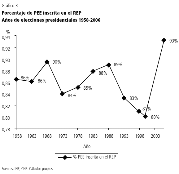 El gráfico 3 muestra el porcentaje de la población en edad electoral (PEE) inscrito en el Registro Electoral Permanente (REP). Se puede observar que los niveles de registro rompen el umbral en que se mantuvo el REP: de un promedio del 13,13 por ciento de la población fuera del mismo entre 1958 y 1988, a un 18,57 por ciento entre 1993 y 2000. Así, el año 2000 es el de menor participación, junto con la mayor brecha entre la PEE y el REP, conjugando en este escenario dos elementos: en primer lugar, las variables institucionales, a saber, la desregularización de las sanciones contra la abstención voto obligatorio y los operativos para la incorporación de nuevos votantes (los que cumplen mayoría de edad, nuevos ciudadanos, y otros excluidos del sistema electoral); en segundo lugar cuentan la variable apatía y desinterés de la población respecto del hecho electoral y la deslegitimación de la democracia (Pérez Baralt, 2001).