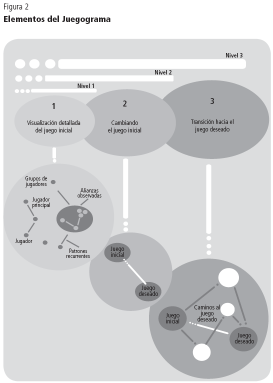 El Nivel 2 se desarrolla a partir de la apreciación del juego inicial (Nivel 1) y constituye la búsqueda de palancas para intervenir en cualquiera de las partes del juego (reglas, incentivos, contextos, etc.), las cuales no están predeterminadas por ningún procedimiento, sino que se fundamentan en las capacidades interpretativas del jugador al dar forma a la estrategia. Se requiere en este Nivel 2 tener un boceto del juego deseado, un concepto o una visualización que recoja la construcción colectiva que se ha ido formando en el proceso de compartir la propia visión del jugador y del resto de los jugadores (compartir significados e intención estratégica). Ese concepto determina, en cierta medida, cuál es el juego inicial que se escoge y qué palancas se privilegian. Por otra parte, debemos reconocer que en la transición de un juego a otro siempre hay varias trayectorias posibles. Por ejemplo, puede haber varios juegos iniciales dentro del espacio de posibilidades de un jugador, pero él debe tener en cuenta su capacidad de acción para cambiar el juego inicial, su capacidad de influencia sobre otros jugadores y, en especial, debe saber si es pertinente el juego inicial seleccionado con respecto a su juego deseado. El juego deseado sugiere el rumbo y requiere de una teoría de cambio para la acción. Un jugador puede no tener objetivos explícitos, pero él actúa desde una lógica que es coherente con sus marcos de referencia y mapas de acción, y que tiene en cuenta las elecciones de los otros jugadores.