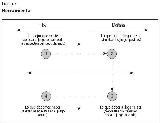 En la realización del cálculo interactivo, un jugador puede utilizar herramientas sencillas o un modo de pensar que le facilite el visualizar, según el nivel del juegograma considerado, las interrogantes cruciales para el cambio y la transición hacia el juego deseado, de una manera que se favorezca el diálogo reflexivo para la acción (figura 3). Por ejemplo, una herramienta que le facilite interrelacionar la apreciación del juego actual (hoy), desde la perspectiva del juego deseado, con los juegos posibles para un período determinado (futuro) y el juego deseado a co-construir (futuro), de manera que en atención a este cálculo pueda realizar apuestas en el juego actual (hoy).