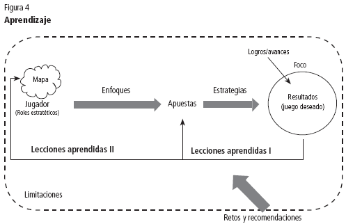 El uso de este tipo de herramientas requiere considerar dos ciclos de aprendizaje (Argyris, 1993): uno que va de los resultados a las apuestas y el otro que va de las apuestas hacia el mapa que da sentido como conjunto orgánico y selectivo a la acción, y que se expresa en el juego deseado. Los dos tipos de aprendizaje se complementan siendo ambos determinantes para un pensar integral (figura 4).