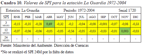 Para la estación La Guardia (1720), cercana al tramo central de la isla de Margarita, destaca el mes de abril con tendencia de normal a húmedo, mientras que el resto de los meses tienden de normal a seco, presentando la mayor cantidad de eventos secos (Cuadro 10).