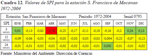 En San Francisco de Macanao, los meses enero, noviembre y diciembre tienden de normal a húmedo; mientras que el mes de abril destaca como el mes más seco, presentando sequía severa y, los meses restantes tienden de normal a seco con valores menores a cero (Cuadro 12).