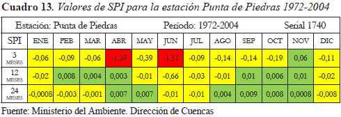 En la estación Punta de Piedras, sólo el mes de noviembre tiende de normal a húmedo; mientras que los meses abril y junio destacan como los más secos, presentando sequía severa. Los meses restantes tienden de normal a seco y, corresponde a la mayor secuencia de eventos secos (Cuadro 13).