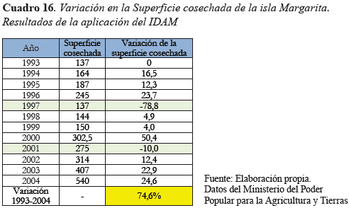 Según los resultados de la aplicación del IDAM, se mostró desde el años 1993 hasta 1996 una tendencia ascendente, aumentando en un 23,7% (245ha). Para 1997, la superficie cosechada descendió en un 78,8% (137ha), para luego ascender. Del año 1996 al 1997 se observó un descenso de la superficie cosechada del 78.8% (137ha), situación que se repite en los años 2000 al 2001, disminuyendo en 10%, pasando de 303 ha a 275ha respectivamente. El máximo incremento de la superficie agrícola se observó en los años 1999 al 2000 con 50,4%, y partir de ese año la actividad agrícola se recuperó muy lentamente hasta el 2004, aumentando en 24,62%. A pesar que para el período 1993-2004, existieron variaciones en la superficie cosechada, en 12 años el cálculo del IDAM dio como resultado el aumento de la superficie en 74,6% (540ha). La escasa superficie agrícola de Margarita, indica que la agricultura, no es la actividad económica relevante de la isla. Posiblemente, estas parcelas estaban destinadas a cultivos de subsistencia o semi-comerciales.