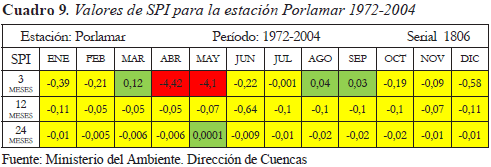 La estación Porlamar, ubicada en la zona costera oriental de la isla de Margarita, destacan como los meses más secos abril y mayo, presentando sequía severa. Los meses marzo, agosto y septiembre tendieron de normal a húmedo con valores mayores a cero; mientras que los meses restantes tendieron de normal a seco (Cuadro 9).