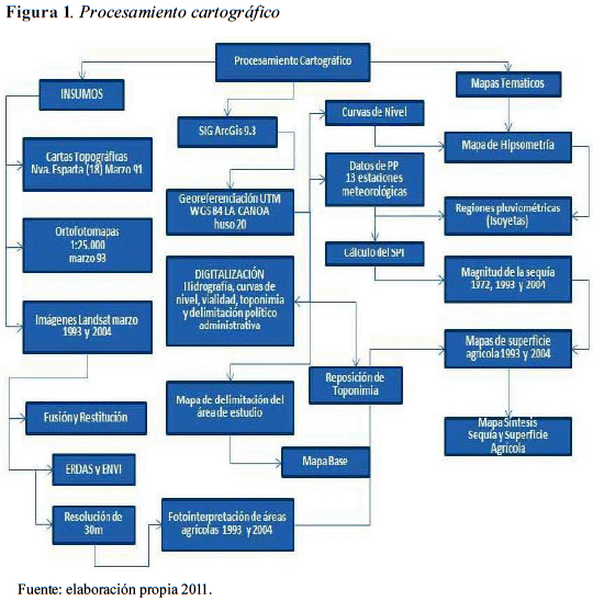 La elaboración del mapa de distribución de la superficie agrícola para los años 1993 y 2004, requirió del procesamiento de las imágenes satelitales Landsat. A partir del año 2003 se averió el sensor remoto de dichas imágenes y, desde entonces, presentan errores que deben ser corregidos utilizando el programa ERDAS 9.2, el cual también permite rectificar las imágenes. La fusión de las bandas 5-4-3 se realizó con el software ENVI 9.8, mientras que su integración con la banda 8 se logró con ERDAS. La delimitación de los polígonos que representan las superficies agrícolas del estado Nueva Esparta resultó de la interpretación de las imágenes con ArcGIS 9.3.