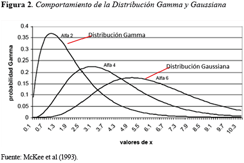 Debido a la variabilidad natural de las precipitaciones y a su distribución asimétrica respecto a los valores medios, es recomendable la aplicación de la distribución Gamma (Thom, 1958). Esta distribución presenta ventajas con respecto a la Gaussiana, ya que se adapta a todo tipo de asimetrías, además de estar definida sólo para valores positivos, que la hace apta para representar frecuencias de precipitación (Serio, 2010).
