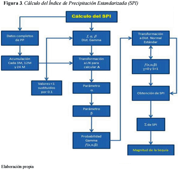 El método utilizado fue el Índice de Precipitación Estandarizada (SPI), el cual fue desarrollado por McKee et al (1993) y está diseñado para cuantificar el déficit de precipitación en diversos períodos, asumiendo que las condiciones de humedad del suelo, son respuesta a las anomalías de precipitación. Fue escogido por su simplicidad y requerimiento mínimo de variables.