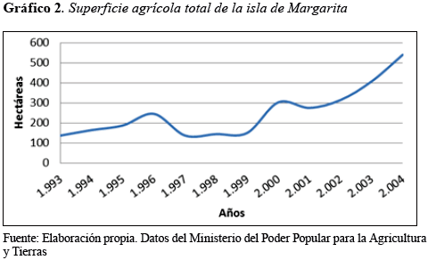 Es importante destacar que a pesar que la agricultura en la isla de Margarita no corresponde a una actividad de gran magnitud para su economía, desde el año 1993 hasta el 2004, la tendencia ha sido ascendente, quintuplicándose la superficie agrícola (Gráfico 2); los motivos de esta tendencia puede ser debido a la influencia de factores políticos, socioeconómicos, culturales, físicos, entre otros, que son objetos de estudio de investigaciones futuras y ajenas a esta investigación.
