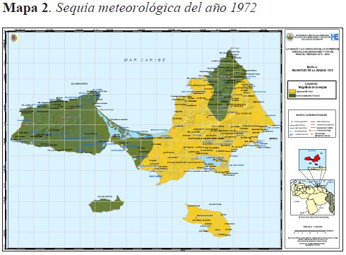 Para el año 1972 la magnitud de la sequía (Mapa 2) se caracteriza desde lo ligeramente seco hasta muy húmedo (escala de McKee SPI modificada). Las zonas altas del sector oriental (Parque Nacional Cerro Copey) se categorizan por ser muy húmedas, debido a precipitaciones abundantes, mientras que el resto del sector está categorizado de ligeramente húmedo a normal, donde se emplazan La Asunción y Pampatar. Las áreas cercanas a Juan Griego son ligeramente secas, resultando como la zona más seca de Margarita para 1972. El sector occidental, integrado por la Península de Macanao y La Laguna de la Restinga, se caracteriza por ser muy húmedo a moderadamente húmedo, por lo que el fenómeno de la sequía meteorológica no tiene influencia. Para el año 1972 la magnitud de la sequía se caracteriza desde lo ligeramente seco hasta muy húmedo (escala de McKee SPI modificada). Las zonas altas del sector oriental (Parque Nacional Cerro Copey) se categorizan por ser muy húmedas, debido a precipitaciones abundantes (aprox. 800mm anuales), mientras que el resto del sector está categorizado de ligeramente húmedo a normal, donde se emplazan La Asunción y Pampatar. Las áreas cercanas a Juan Griego son ligeramente secas, resultando la región más seca de Margarita para 1972. Estos resultados son coyunturales debido al comportamiento presentado por la precipitación para el año en cuestión.