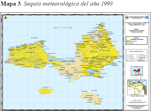 El análisis de la magnitud de la sequía para el año 1993 se realizó con la finalidad de compararla con la evolución de la superficie agrícola para el mismo año. Para el año 1993 (mapa 3), la magnitud de la sequía aumentó (SPI -1.30) presentando sequía moderada en la cercanía de La Asunción. El sector oriental se caracterizó por ser una zona ligeramente seca; por otro lado, en el sector occidental se presenta un núcleo de sequía moderada en zonas aledañas al centro poblado San Francisco de Macanao, mientras que el resto es un área ligeramente seca. El extremo oeste de la Península de Macanao, correspondiente al centro poblado Boca del Pozo, se caracteriza por ser normal al igual que el tramo central Laguna La Restinga.
