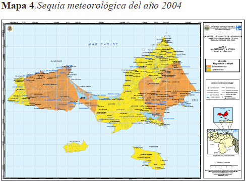 Para el año 2004, las zonas de sequía tienen menos predominancia que las zonas húmedas, categorizada desde ligeramente seco hasta muy húmedo (mapa 4). En las adyacencias de La Asunción se halla un foco muy húmedo (SPI > 1.50). Las zonas de transición se emplazan en las laderas y algunos valles caracterizadas por ser moderadamente húmedas y corresponden a precipitaciones abundantes, donde se encuentran poblados como Tacarigua y San Juan Bautista. Las zonas ligeramente húmedas se extienden desde el tramo central hasta el sector oriental. La Península de Macanao es moderadamente húmeda y hacia la costa oeste de la península, en las cercanías de Boca del Pozo es de ligeramente húmedo a normal. Hacia el noreste de Margarita, en Juan Griego y las zonas costeras inmediatas al centro poblado, se categorizan como ligeramente seca, resultando ser la única región de la isla donde existe influencia del fenómeno de la sequía.