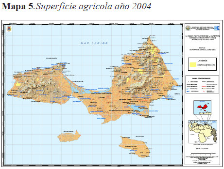 La superficie agrícola ubicada en el tramo central de la isla de Margarita para 1993 como se puede observar en el mapa 5, desapareció para el 2004. Se estimó que este proceso se debió a la poca extensión de cada parcela (menor de 1ha) y al desarrollo de otras actividades. En el sector occidental de la isla de Margarita, específicamente en los centros poblados Boca del Pozo y San Francisco de Macanao, la superficie agrícola aumentó para el año 2004 con respecto a 1993.