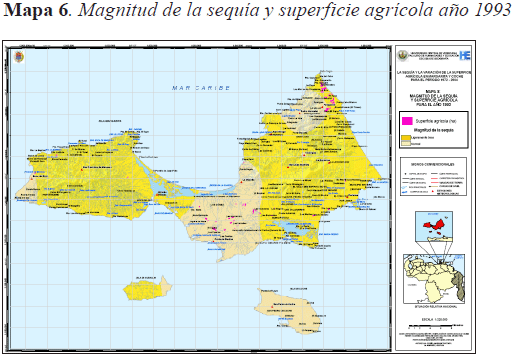 Para analizar la influencia de la sequía meteorológica en la variación de la superficie agrícola vegetal. De acuerdo a lo observado en ambos mapas síntesis, la incidencia de la sequía se apreció en las exiguas áreas agrícolas para ambos años. La ausencia de lluvias implica no sólo la posibilidad de que exista sequía, sino que también podría acarrear la disminución de la superficie agrícola en una región. En la isla de Margarita, el régimen pluviométrico pudo haber afectado a la actividad agrícola en cuanto al tipo de agricultura desarrollada, y la inexistencia de importantes corrientes de agua permanentes, ha condicionado el desarrollo de la agricultura de secano, que supone ser una actividad de subsistencia o semi-comercial. De manera asombrosa, las evidencias sobre la influencia de la sequía en la variación de la superficie agrícola en el área de estudio son contrarias a la hipótesis de trabajo planteada originalmente, es decir, desde 1993 (mapa 6) la superficie agrícola se ha quintuplicado. Para este año, 113,6ha de superficie agrícola, se emplazaban en zonas afectas por la sequía ligera, ubicadas en la cercanía del centro poblado Paraguachí, al norte de la isla. En el tramo central, se ubicaban 35ha conformadas por pequeñas parcelas en áreas de condición norma.