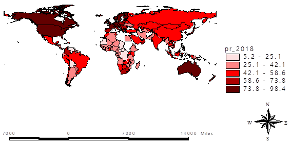 A partir da figura 2 é possível verificar a avaliação do nível de defesa da propriedade privada dos países no ano de 2018. Nota-se que os países com maior nível de Direito de Propriedade se encontram na América do Norte, União Européia, Japão e Austrália. Já os países com as piores avaliações no índice localizam-se na África, América do Sul e Oriente Médio.