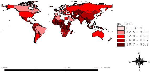 A distribuição geográfica do índice que mensura o tamanho do Estado é apresentada na figura 3. Os países que têm maior participação do Estado na economia concentram-se na África, Ásia Central, Ásia Oriental e parte da América do Sul e Central. Em contrapartida, os países com menor participação do Estado estão na União Européia, Canadá e alguns países da África, América do Sul e Japão