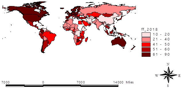 As figuras 4 e 5 apresentam a distribuição dos índices que mensuram, respectivamente, a Liberdade de Investimento e a Liberdade Financeira para os países no ano de 2018. De forma geral, os países mais bem avaliados na defesa da Liberdade de Investimento e Financeira estão localizados na América do Norte, União Européia, Japão e Austrália. Por outro lado, os países com as piores avaliações nos dois índices integram as regiões da África, América do Sul, Oriente médio, Ásia Central e Sudeste da Ásia.