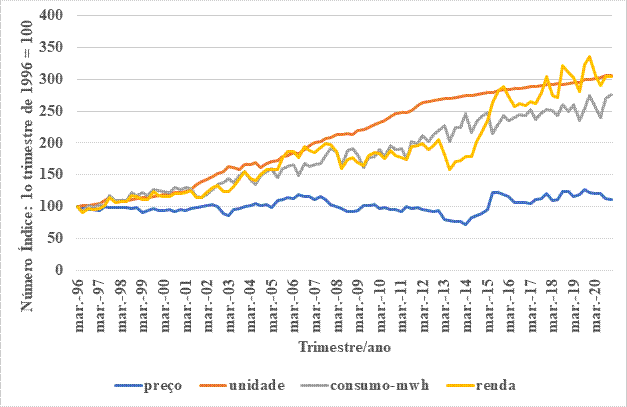 Figura 1: Número de unidades consumidoras na Zona Rural em milhões, consumo em mwh, preço da energia e renda do setor rural no período de 1996 a 2020 - valores trimestrais.