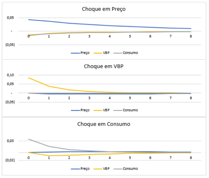 O choque de um desvio padrão no VBP, representado pelo segundo gráfico da Figura 2, demonstra que o Preço e o Consumo não apresentam alterações no curto prazo, com desvios próximos a zero. O choque no VBP na própria variável apresenta uma resposta positiva e elevada no primeiro momento, mas estabiliza a cada período, retornando à tendência próximo ao sexto período.