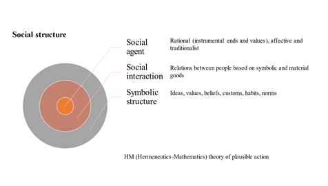 Na teoria da ação social plausível, a chance de uma ação e/ou evento relacionado a ela ocorrer ou não ocorrer existe em termos de plausibilidade e probabilidade do acaso. A teoria da ação social plausível é entendida em termos da relatividade espaço-temporal da ação esperada ou prevista, dadas determinadas circunstâncias e contextos interacionais, e pode ser descrita matematicamente a partir das propriedades de razão e proporção, em termos percentuais e de probabilidade. A hermenêutica permite a interpretação no nível do agente, sem visar a generalização nomológica. A hermenêutica-matemática é a utilização dos princípios de interpretação de textos de contextos ou configurações específicas. No entanto, o padrão estrutural, em um nível superior de agregação de indivíduos e grupos, é obtido por meios matemáticos, a partir de regressões lineares e categóricas, que nos fornecem respostas das correlações em termos percentuais. A hermenêutica-matemática é vista aqui como uma metodologia de análise, uma perspectiva analítica. Na hermenêutica-matemática avaliamos apenas indivíduos e unidades orçamentárias (grupos de indivíduos), a estrutura social não restringe nem orienta a ação social, este é o padrão de relações ou interações sociais estabelecidas entre indivíduos, existe como matriz de correlações, e não como essência ou como condição invisível de existência anterior e externa ao indivíduo. O indivíduo tece a teia de significados que utiliza para sua autocompreensão do mundo.