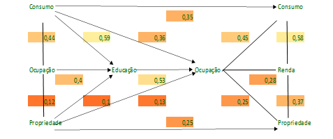 A estatística de Path Analysis é utilizada porque permite o cálculo, mesmo que não simultâneo, de diferentes variáveis de resposta (explicadas). Isso nos permite denotar correlações na origem social, compreendida como causa, termos intervenientes como educação e renda e o destino social, analisado por três fatores: propriedade, consumo e ocupação. São utilizadas oito variáveis: três independentes - propriedade privada, ocupação profissional e padrão de consumo; duas intervenientes - educação escolar e renda; e três variáveis dependentes - propriedade privada, ocupação profissional e padrão de consumo.