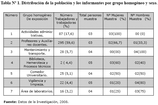 El muestreo aplicado es dirigido e intencional, el investigador tiene la libertad para elegir ciertos casos, luego, analizarlos y más adelante seleccionar casos adicionales para confirmar o no los primeros resultados. Posteriormente puede elegir casos homogéneos y luego heterogéneos para probar los limites (Hernández, R., Fernández, C. & Batista, L. (2003, p.666). En la conformación de los grupos de informantes, se intentó respetar la diversidad de los trabajadores de la universidad, de acuerdo a los grupos y áreas de trabajo para, de esta forma, a partir de sus experiencias, identificar las condiciones peligrosas de trabajo de cada uno de los grupos establecidos (Ver Tabla Nº 1).