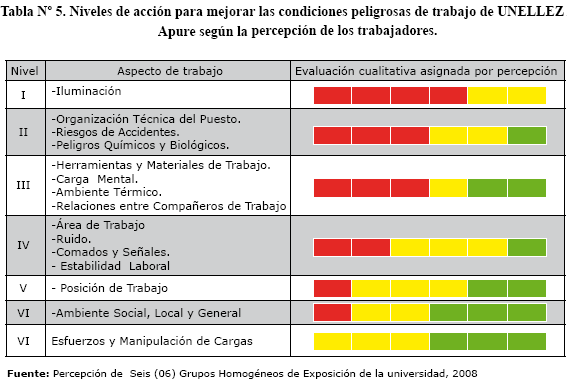 Tomando en consideración las afirmaciones de los seis grupos homogéneos que se perciben concordantes con la realidad se optó por realizar una visión panorámica de las condiciones de trabajo en toda la universidad a fin de visualizar este centro de trabajo en forma general. De ello, se tiene que los aspectos identificados como en peligro están en rojo, los alerta se refieren en amarillo y los satisfactorios en verde. En esta parte, se realiza una visualización global del centro laboral partiendo de las condiciones más adversa a la de menor gravedad, para, luego establecer una clasificación de las condiciones peligrosas de toda la universidad. Dicho análisis es llevado a cabo, a partir de la percepción de todos los trabajadores y trabajadoras abordadas de forma conjunta, obviando la información del grupo de comedor por estar sesgada (Ver Tabla Nº 5).