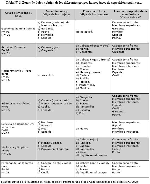 El personal de la biblioteca y archivos, así como los docentes, se exponen a posturas incómodas en forma prolongada debido a la falta de un mobiliario adecuado. Esto es una situación que podría generar a largo plazo problemas de salud en lo relativo a trastornos musculoesqueléticos. Es importante destacar, que en la escogencia del mobiliario en la universidad estudiada no se consideraron las características antropométricas de las personas que ocupan los puestos de trabajo, por tanto, se observa deficiencias en el diseño del puesto. En el caso de las mujeres y hombres que laboran en pantalla de visualización de datos, por lo inadecuado del mobiliario, se exponen a posturas incómodas y tareas repetitivas que le pueden ocasionar daños crónicos y discapacitante. (Tabla Nº 6 y 7).