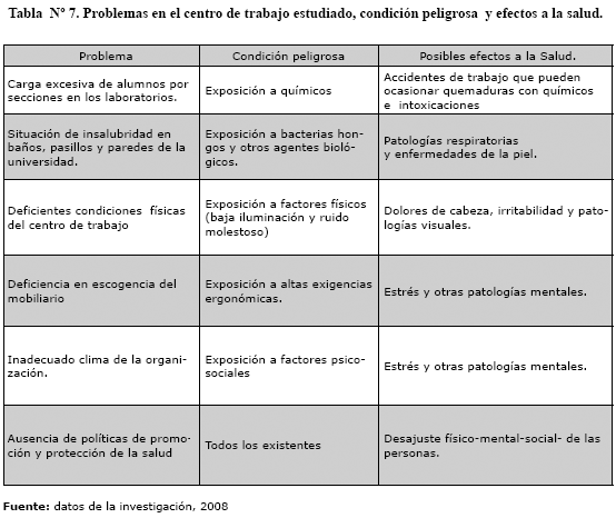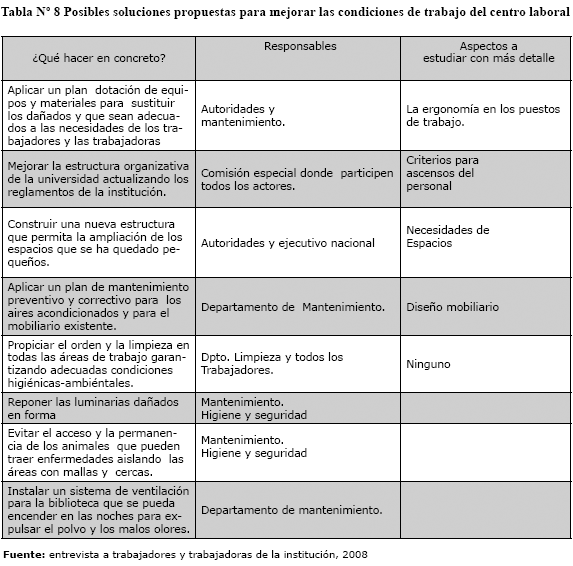 Las condiciones ambientales de trabajo en general son inadecuadas, el ruido es molestoso y aumenta las exigencias en la intensidad de la voz de trabajadoras y trabajadores La iluminación es el aspecto peor percibido en toda la universidad, existe problemas en la organización técnica del puesto, existen peligros químicos, biológicos y altas exigencias ergonómicas y psicosociales que afectan a toda la población trabajadora y en mayor proporción a las mujeres. (Tabla Nº 8).