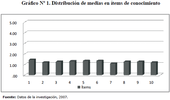 Los ítems relacionados con la variable "conocimiento", presentaron una media del 1.274, lo que refiere que la mayoría de los participantes no seleccionó la respuesta correcta, mostrando así su bajo conocimiento en prevención de riesgos laborales (Ver Gráfico Nº 1).