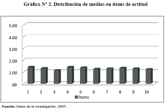 Los ítems relacionados con la variable "actitud", presentaron una media del 1.303, resultando esto semejante a la variable "conocimiento", donde la mayoría de los trabajadores no eligió la respuesta correcta, lo que revela que los trabajadores asumen una actitud que pone en riesgo su seguridad (Ver Gráfico Nº 2).