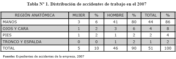 Específicamente, la empresa en la cual se llevó a cabo el estudio registró durante el año 2007, un total de 51 casos de accidentes de trabajo. El 86% fueron lesiones que ocurrieron en las manos, es decir, 44 casos, 4 casos en ojos y cara (8%); 2 accidentes en los pies (4%) y un caso en tronco y espalda (2%), Ver Tabla Nº 1. Tales datos, fueron detonantes para llevar a cabo una investigación con el objetivo conocer la cultura preventiva entre los trabajadores lesionados en una empresa metalmecánica.